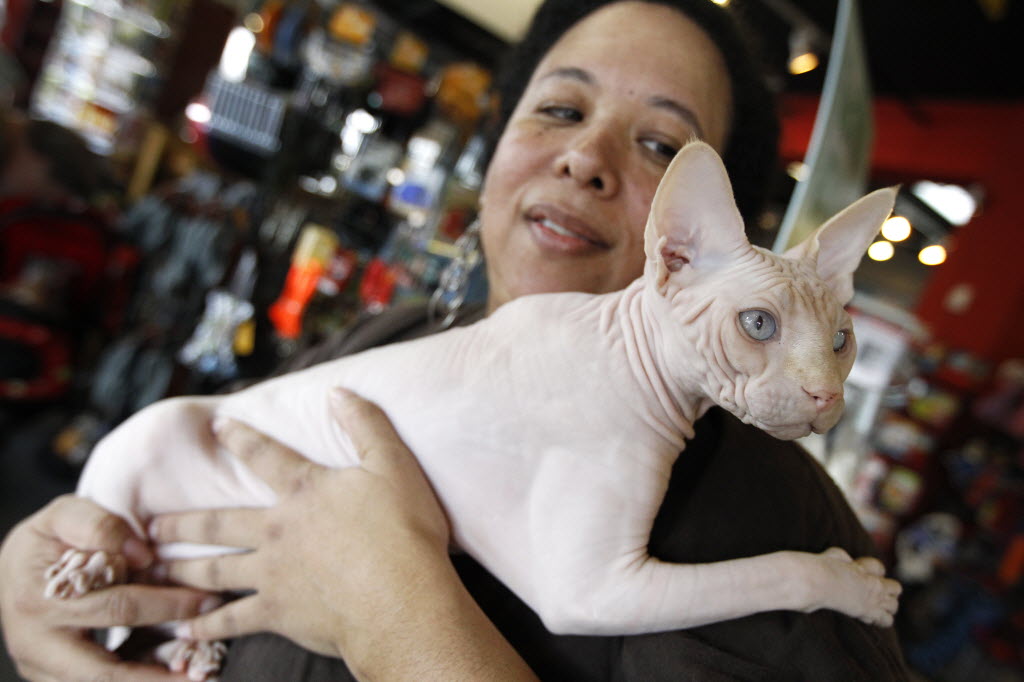 A four-year-old hairless cream point Sphynx, named Moshe Moshi, is held by her owner Carol Meir of Takoma Park, Md., at The Big Bad Woof, a pet supplies store, in Washington. Meir is managing her cat’s allergies with a venison and pork diet and daily medication. She figures it cost her about $750 for vets and tests. Medicine is $250 a year. (AP Photo/Charles Dharapak)