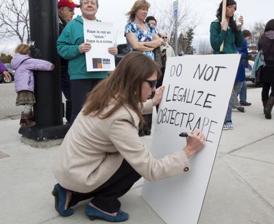 Protesters, rallying against the Senate bill that requiring an ultrasound before a woman considers an abortion, gather at the Capitol in Boise on Wednesday to encourage Gov. Butch Otter to veto the bill. The Idaho Capitol was part medical clinic, part reality TV show and all cultural battlefield as an anti-abortion advocate secured a basement meeting room to conduct live ultrasound procedures on six women before a mostly female audience of 150. Story here. (AP Photo/Idaho Statesman, Katherine Jones)