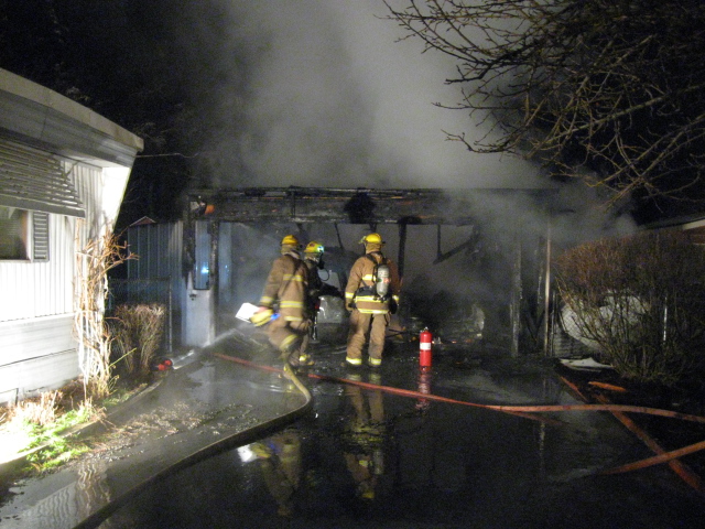 Firefighters from the Spokane Valley Fire Department responded to a reported garage fire in the 6500 block of East Seventh just after 4 a.m. today. The garage was heavily damaged, but firefighters were able to keep the flames from spreading to a nearby mobile home. No one was injured and the homeowner had insurance, according to a Valley Fire press release. There’s no word yet on the cause of the fire. Photo courtesy the Spokane Valley Fire Department .