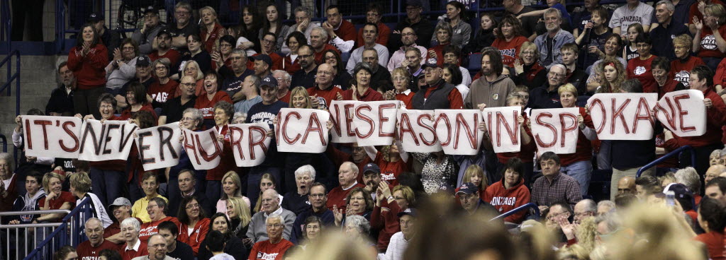 Gonzaga fans hold up signs in the sold out arena as the team plays Miami in the second half of an NCAA tournament second-round women’s college basketball game in Spokane Monday. Gonzaga beat Miami 65-54.(AP Photo/Elaine Thompson)