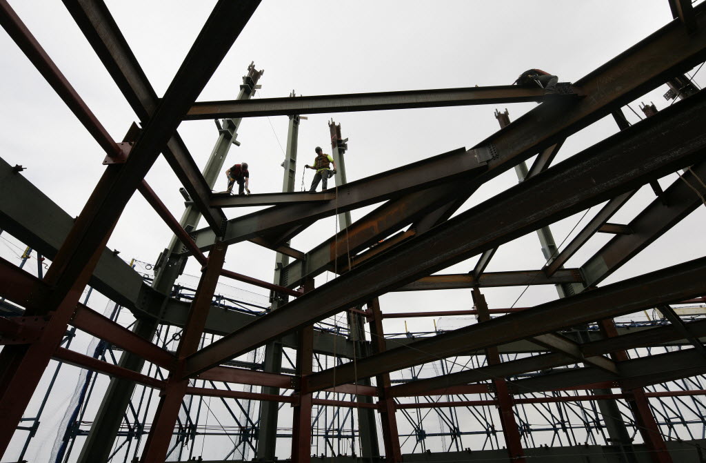 Ironworkers connect steel beams above the 93rd floor of One World Trade Center, Friday in New York, The tower, formerly known as the Freedom Tower, will reach 104 floors and is scheduled for completion in 2013. (AP Photo/Mark Lennihan)