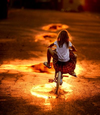 Opal Cosby lifts her legs as she rides through puddles on Ironwood Drive in Hartselle, Ala., following a rainy Thursday afternoon. The setting sun lit the puddles with a red light at the end of the day. (AP Photo/The Decatur Daily, Gary Cosby Jr.)