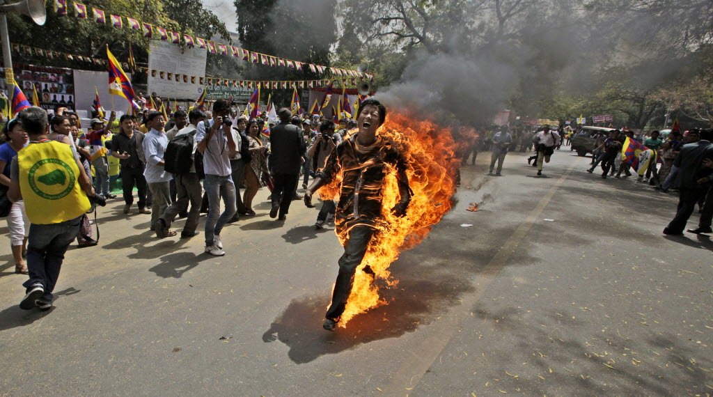 A Tibetan exile man, identified as Jampa Yeshi, runs engulfed in flames after self-immolating during a demonstration in New Delhi, India, Monday. Yeshi lit himself on fire and ran shouting through a protest in the Indian capital Monday, just ahead of a visit by China’s president Hu Jintao and following self-immolations in the Himalayan region against Beijing’s rule. (AP Photo/Manish Swarup)