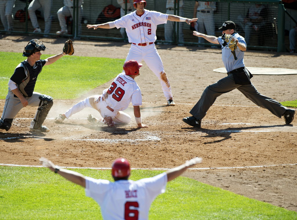Nebraska’s Chad Christensen (2), home plate umpire Pat Spieler and Nebraska third base coach Will Bolt (6) signal a safe call for Richard Stock (39) sliding past Illinois catcher Kelly Norris-Jones in the third inning of an NCAA college baseball game Saturday in Lincoln, Neb. (AP Photo/The Journal-Star, Ted Kirk)