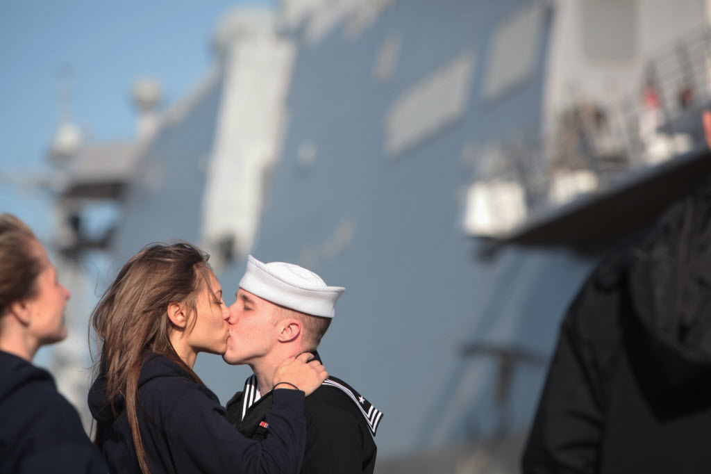 Marissa Shadler kisses boyfriend Cory Dutkiewicz goodby as he prepares to deploy on The USS New York, an amphibious transport dock ship, from Naval Station Norfolk in Norfolk, Va. on Tuesday. This is the first deployment of the ship, parts of which were built with steel from the World Trade Center. The New York is part of the Iwo Jima Amphibious Ready Group and will operate in the Mediterranean Sea and Arabian Gulf. (AP Photo/The Virginian-Pilot, Steve Earley)