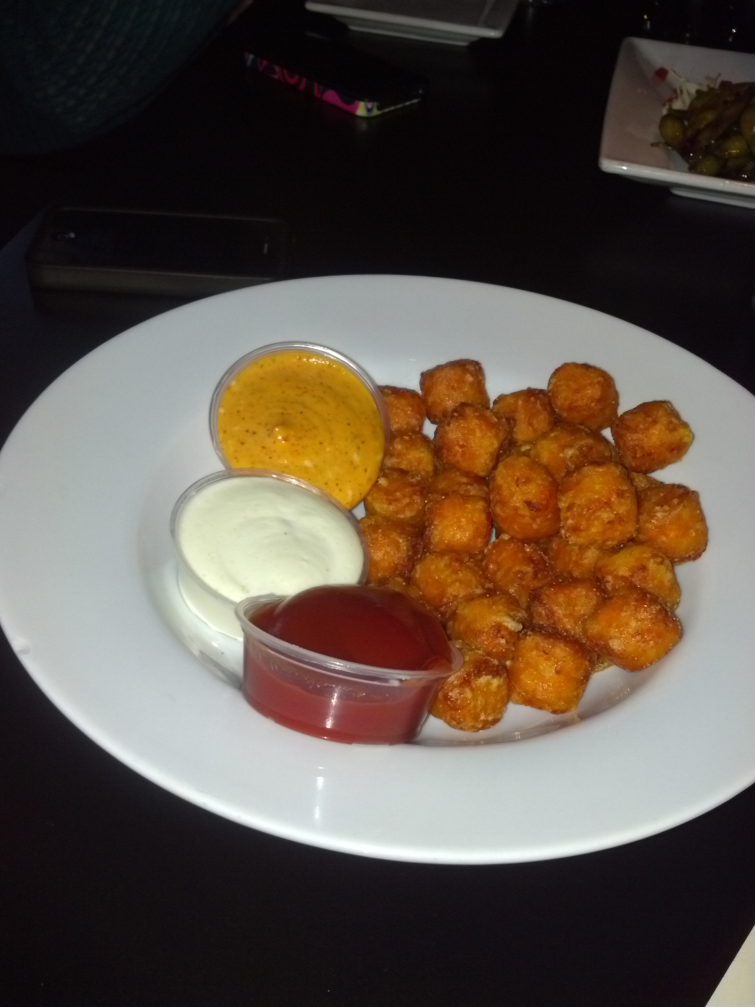 You know how much I love sweet potato fries, right? Well, a few days ago at the Wave I was introduced to a bowlful of their cute little cousins, called Sweet Puffs. Oh. My. Goodness. A little crunchy. A little chewey. Just sweet enough to do the spicy dipping sauce justice. I may never eat a regular potato tot again. Did I just say that? I did. And that’s saying something.