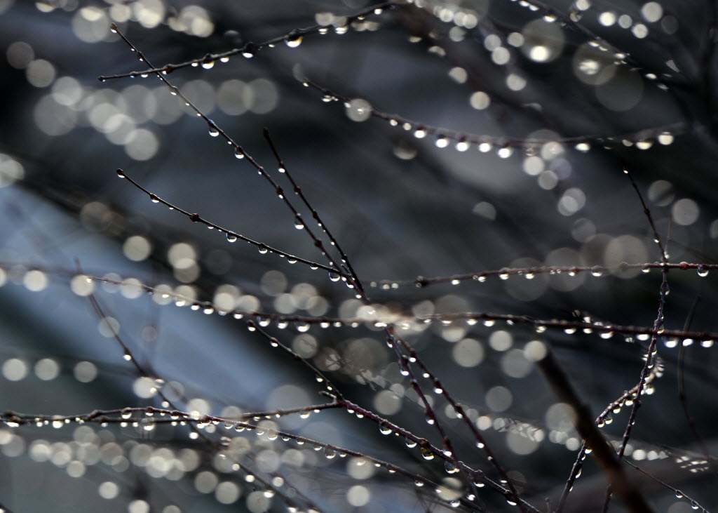 Raindrops from Monday’s deluge are illuminated by morning sun as they cling to the canes of a dogwood shrub in Post Falls on Tuesday. (SR photo: Jesse Tinsley)