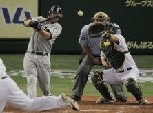 (AP photo: Dustin Ackley hits an RBI single in the 11th inning of their American League season opening MLB baseball game at Tokyo Dome in Tokyo today)