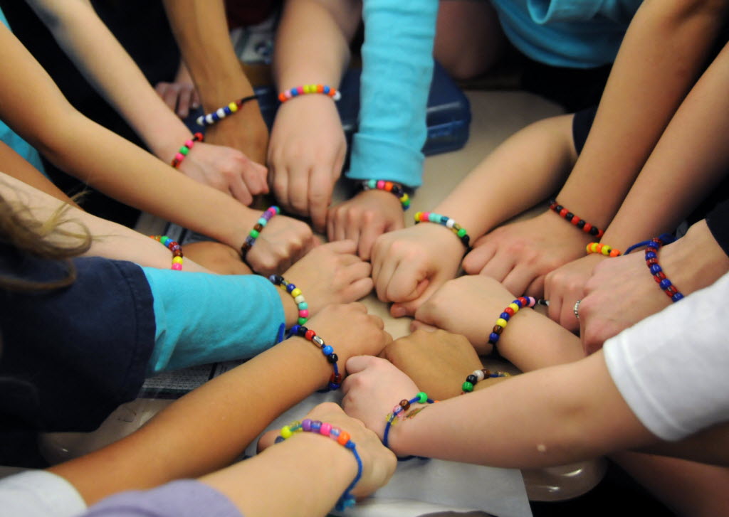 Shenandoah Elementary third grade students show the bracelets they made Wednesday in memory of fellow student Cristian Sanchez who died in a Tuesday morning house fire in Shenandoah, Pa. (AP Photo/Republican-Herald, David McKeown)
