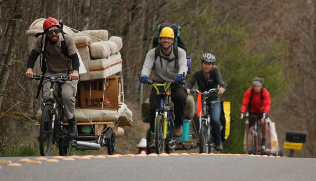 Tim Flores, left, moved his belongings by bicycle to a new Bellingham, Wash., residence, with a little help from his friends. Flores, an employee of the Community Food Co-op in Bellingham, and his friends rode over five miles during rush-hour traffic. (AP Photo/The Bellingham Herald, David Rzegocki)
