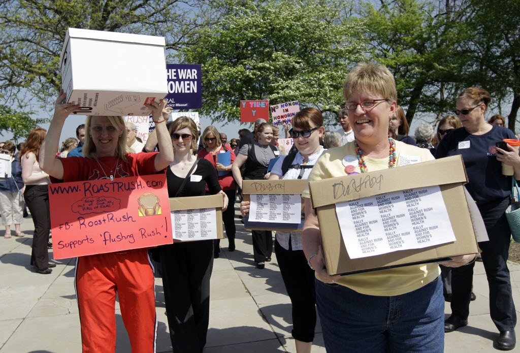 Protesters carry boxes containing petition signatures Wednesday in Jefferson City, Mo. The protesters delivered 35,000 petition signatures Wednesday to the House speaker’s office opposing the inclusion of conservative talk show host Rush Limbaugh in the Hall of Famous Missourians in the latest in a series of opposition efforts to Limbaugh’s selection. Story here. (AP Photo/Jeff Roberson)