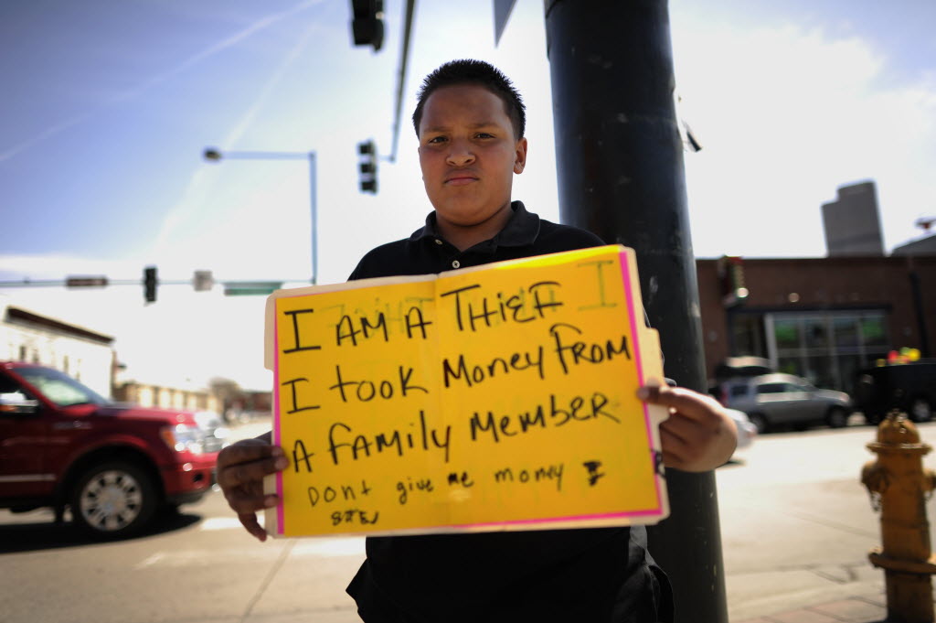 Jose Gonzalez, 12, holds a sign he was made to carry on the corner of 22nd and Larimer Street in downtown Denver Tuesday for his punishment. Gonzalez took $100 from the wallet of his cousin in their Aurora home. His father Joseph set his punishment to carry the sign telling of his mistake, near the Fast Cash where he works. (AP Photo/The Denver Post, Joe Amon)