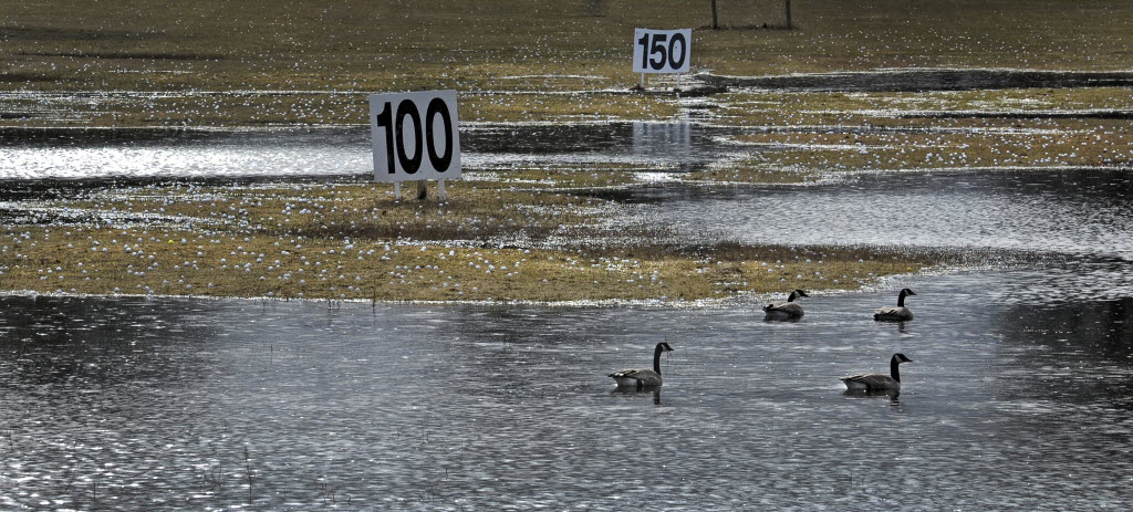 Golf balls lie in the soggy Indian Canyon golf course driving range as geese swim in some of the deeper puddles Thursday in Spokane. Rainy cold days have delayed the opening of the course which hopes to welcome golfers this weekend or the beginning of next week. The soggiest March in Inland Northwest history isn’t over yet. Story here. (SR photo: Christopher Anderson)