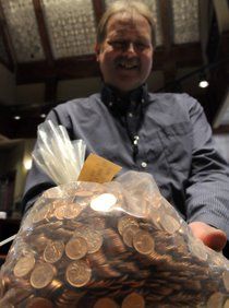 (Jesse Tinsley SR photo: Court Peterson, who sells precious metals and coins, holds a bag of 1964 Canadian pennies at Coins Plus in Spokane on Friday)