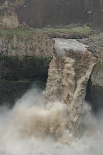 The falls are chocolate brown and thundering about 185 feet in a billowing cloud, as the folks at Lyons Ferry Marina verify in the photo (left).