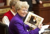 (Katherine Jones Statesman/AP photo: Retiring Senator Shirley McKague (R-Meridian) is tickled by a photo of her at the Senate podium earlier in the session)