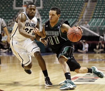 Hawaii guard Jeremiah Ostrowski (11) drives to the basket while being guarded by Idaho guard Deremy Geiger (35) during their NCAA college basketball game in the Western Athletic Conference tournament earlier today at The Orleans Arena in Las Vegas. Hawaii defeated Idaho 72-70. Story here. (AP Photo/Eric Jamison)