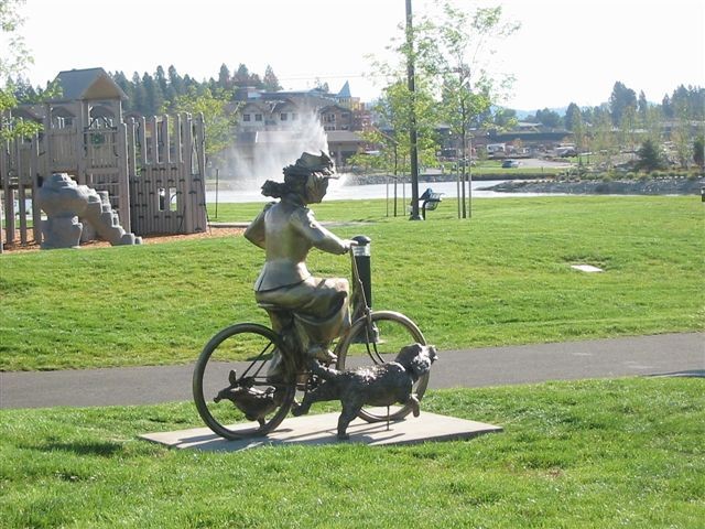 “Kate,” a statue by David Clemons, is one of the pieces of public art that adorn Lake City. It depicts a turn of the century lady cyclist accompanied by two dogs. You can see it at Riverstone Park. You can also view the many pieces of Coeur d’Alene public art here. (Photo courtesy of city of Coeur d’Alene Web site)