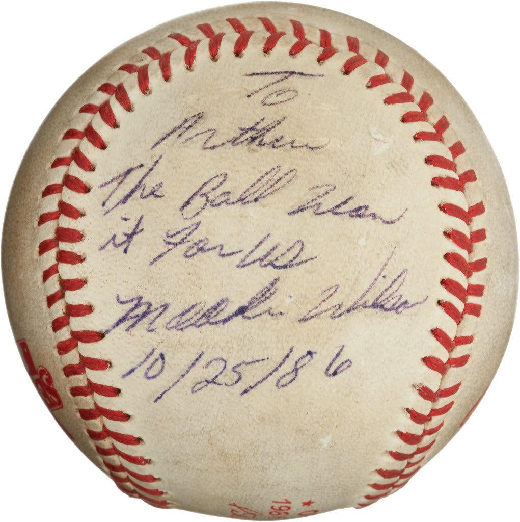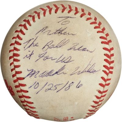 This undated image, provided by Heritage Auctions, shows the “Buckner Ball,” the baseball that dribbled between the legs of Boston Red Sox first baseman Bill Buckner during the 10th inning of Game Six of the 1986 World Series. The error gave the New York Mets the win and the team went on to beat the Red Sox the next night to win the World Series. The writing, by Mookie Wilson addressed to Mets traveling secretary Arthur Richman says: To Arthur, the ball won it for us, Mookie Wilson, 10/25/86. Heritage Auctions says the ball is expected to bring in more than $100,000 on Friday in Dallas. (AP Photos/Heritage Auctions)
