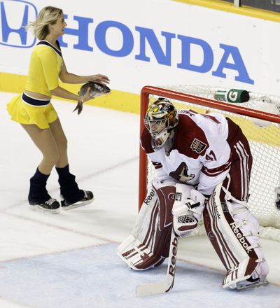 A Nashville Predators ice girl skates past Phoenix Coyotes goalie Mike Smith (41) as she carries a catfish off the ice after it was thrown from the stands in the first period of Game 3 in an NHL hockey Stanley Cup Western Conference semifinal playoff series on Wednesday in Nashville, Tenn. (AP Photo/Mark Humphrey)