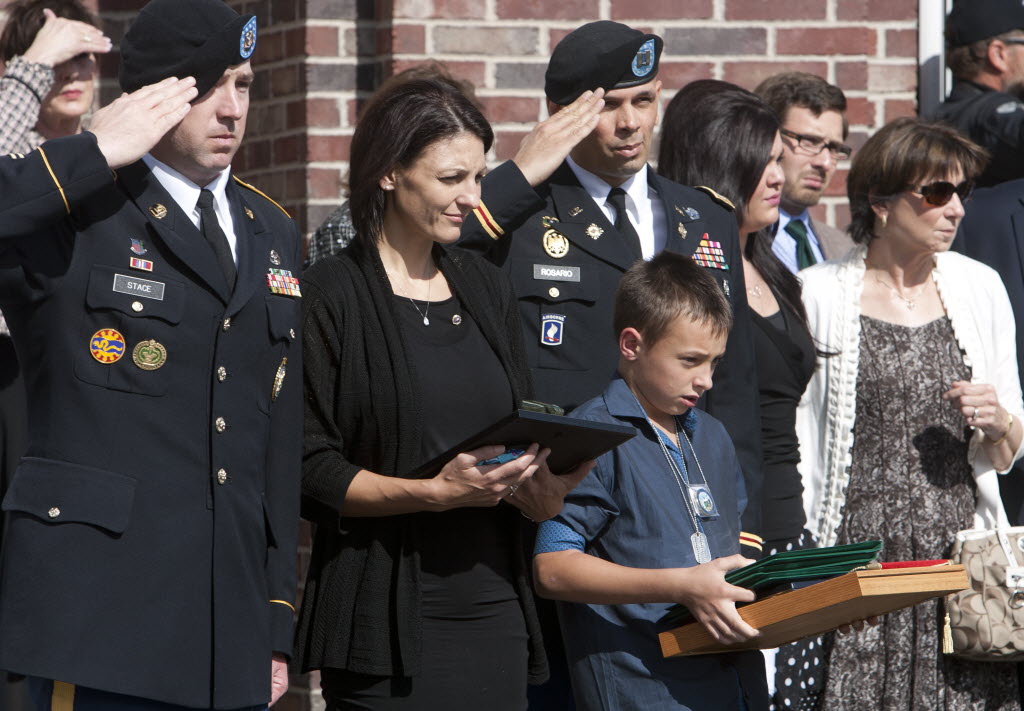 Camille Workman, center, and her son, Cole Hayes, young boy at right, watch the casket of husband and stepfather, Army Sgt. Chris Workman, after a funeral service in Eagle on Thursday afternoon. Workman, 33, was killed in a helicopter crash April 19 in Afghanistan, on a mission with three other crewmen, who also died, to rescue a wounded Afghan police officer. More than 100 people, including Gov. Butch Otter, attended the service at Eagle Christian Church. Story here. (AP Photo/Idaho Statesman, Katherine Jones)