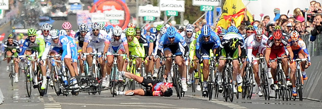 Mark Cavendish, of Great Britain, bottom center, crashes during the third stage of the Giro d’Italia, Tour of Italy cycling race, in Horsens, Denmark, earlier today. Matthew Goss of Australia won the third stage of the Giro d’Italia on Monday, while world champion Mark Cavendish and overall leader Taylor Phinney were involved in a crash in the high-speed sprint finish. Phinney maintained the overall lead, since times are neutralized when there are crashes at the end of flat stages. (AP Photo/Fabio Ferrari)