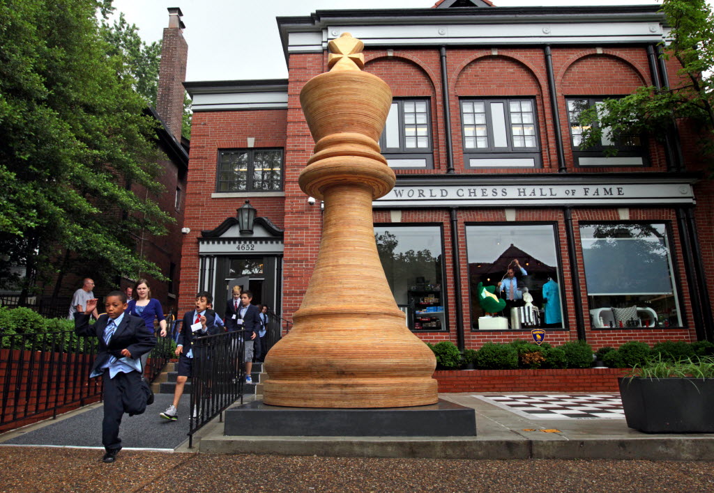 A group of students from the St. Louis Language Immersion School leaves the World Chess Hall of Fame in St. Louis’ Central West End where the world’s largest chess piece was dedicated today. The 14.5-feet-tall king piece, weighs 2280 pounds and is 6 feet wide. It is made out of layered plywood that has been stained and sealed. (AP Photo/St. Louis Post-Dispatch, Christian Gooden)