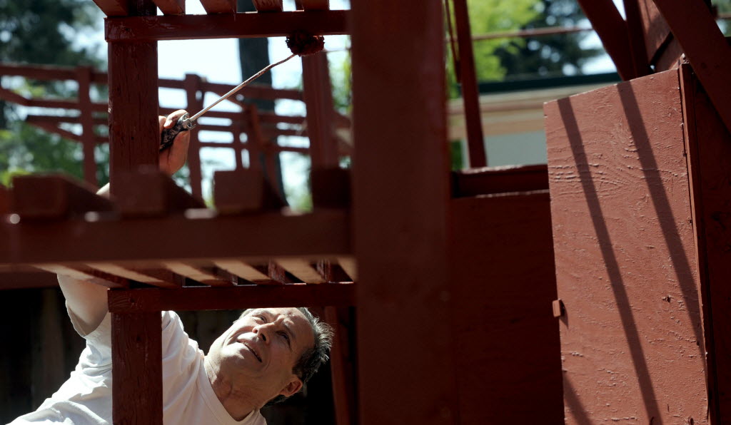 Jim Preston of Dutch Farms puts a fresh coat of paint on his stand at the Kootenai County Farmers Market today.. Saturday is opening day for the outdoor market in located on the corner of U.S.95 and Prairie Avenue in Coeur d’Alene. (AP photo: Kathy Plonka)