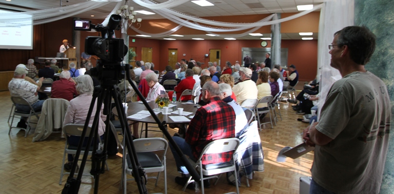 Former Coeur d’Alene Press reporter Keith Erickson, lower right, listens at the back of the Lake City Senior Center Tuesday evening while state Rep. Kathy Sims, R-Coeur d’Alene, denounces Lake City Development Corp. Keith now handles public relations for the urban renewal district.