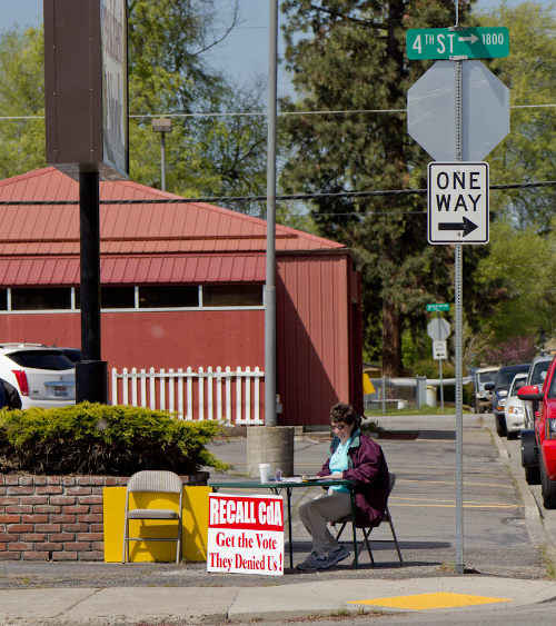 A Berry Picker sends in this photo of a Coeur d’Alene Recaller set up near the Breakfast Nook on Fourth Street today.