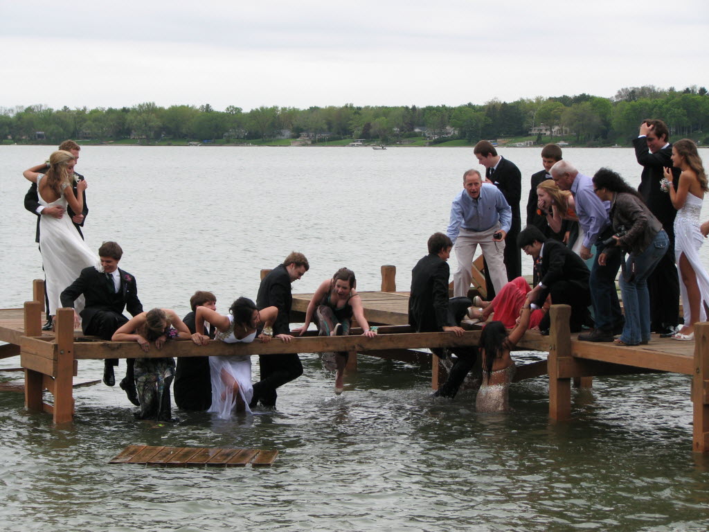 In this photo provided by Susan Orne, a group of Wisconsin high school students make their way out of the waist-deep water after a pier they were posing for photos on prior to their prom collapsed, sending about half of the 18 students on the pier into a lake, in Oconomowoc, Wis. on Saturday. The kids sloshed toward one student’s home, where they all broke out the towels, hair dryers and clothes dryers. Everyone made the big event, and Orne says the incident has provided them a memory they’ll all enjoy at their 50th reunion. (AP Photo/Courtesy Susan Orne)