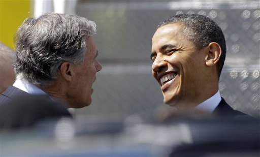 President Barack Obama greets former Washington Rep. Jay Inslee, who is currently a Democrat running for governor, after Obama arrived in Seattle, Thursday, May 10, 2012.