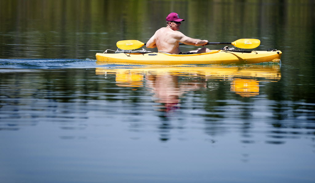 Michael Langohr, of Kalispell, Mont., paddles his way across Foys Lake on Monday afternoon, west of Kalispell. (AP Photo/Daily Inter Lake, Patrick Record)