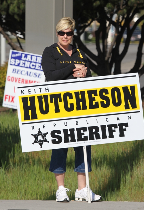Lisa Hutcheson is standing by/for her man today at the northwest corner of Highway 95 & Appleway. Hubby Keith is running in a three-way GOPrimary race for sheriff against sheriff’s Major Ben Wolfinger and John Green. Keith Hutcheson was standing at one of the other corners of the busy intersection. (Phantom Photographer photo)