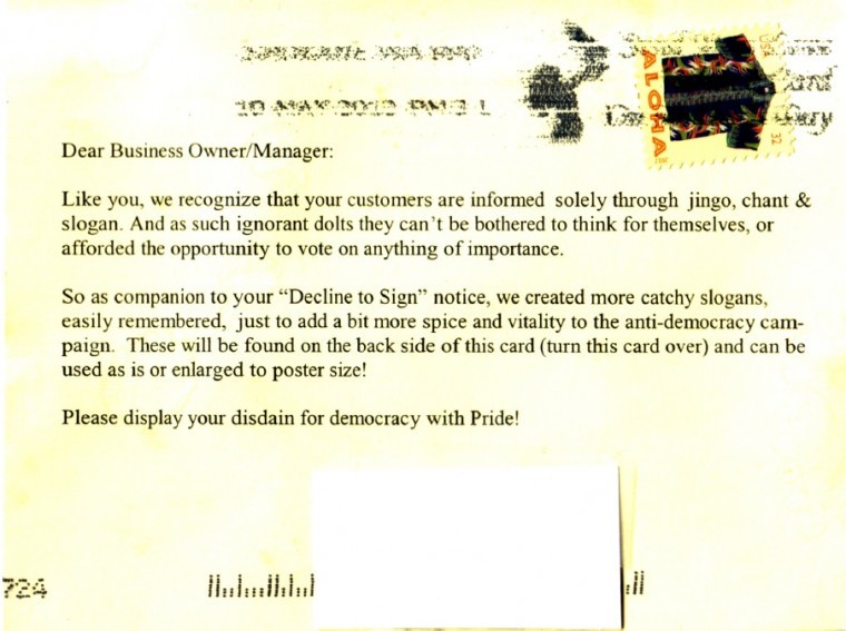 More mocking, anonymous postcards have been received by some downtown businesses that openly oppose the ongoing effort to recall Coeur d’Alene Mayor Sandi Bloem and council members Mike Kennedy, Deanna Goodlander and Woody McEvers. Several downtown businesses received similar cards earlier this month, and at the time, Recall CdA petitioners and organizers told The Press they had no idea who was sending them. The cards, mailed from Spokane, have been sent to some, but not all, the businesses that openly support the officials targeted for recall. Follow link for copies of postcards at CdA Press Online here. (Coeur d’Alene Press photo)