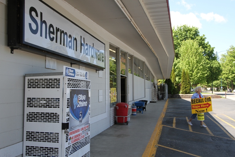 Sharon Culbreth heads from Sherman Hardware to try to attract motorists on East Sherman Avenue to sign her Recall petitions against Mayor Sandi Bloem and council members Deanna Goodlander, Woody McEvers and Mike Kennedy. Fellow Recaller Rus McClain was on the other side of the street with his sign. (Phantom Photographer photo)