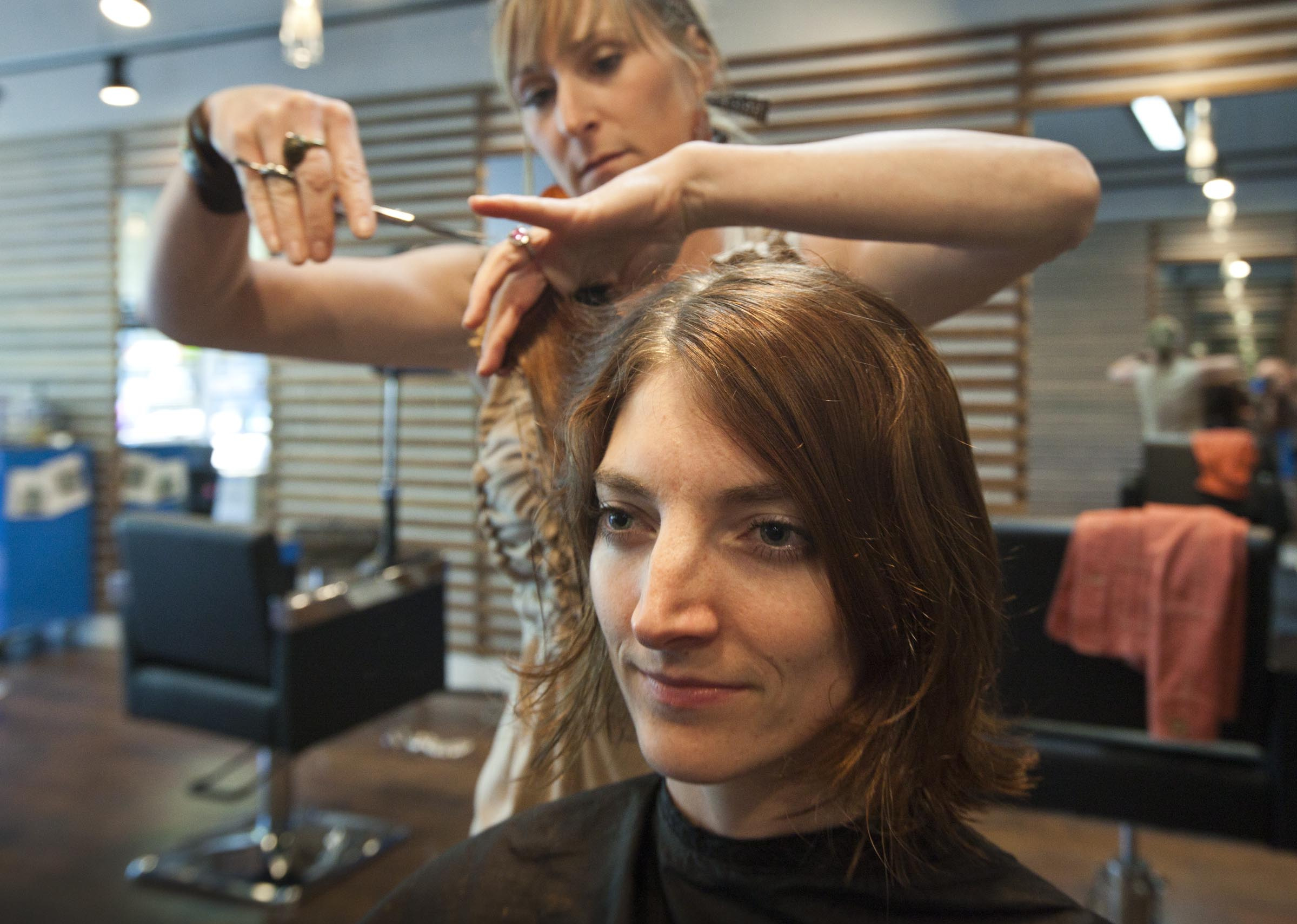 Boise State student Jozey Mitcham watches as her cousin Abby Sherbine, a stylist at Kiwi Blue Salon in Boise, designs a fresh look for her graduation from BSU.ISE