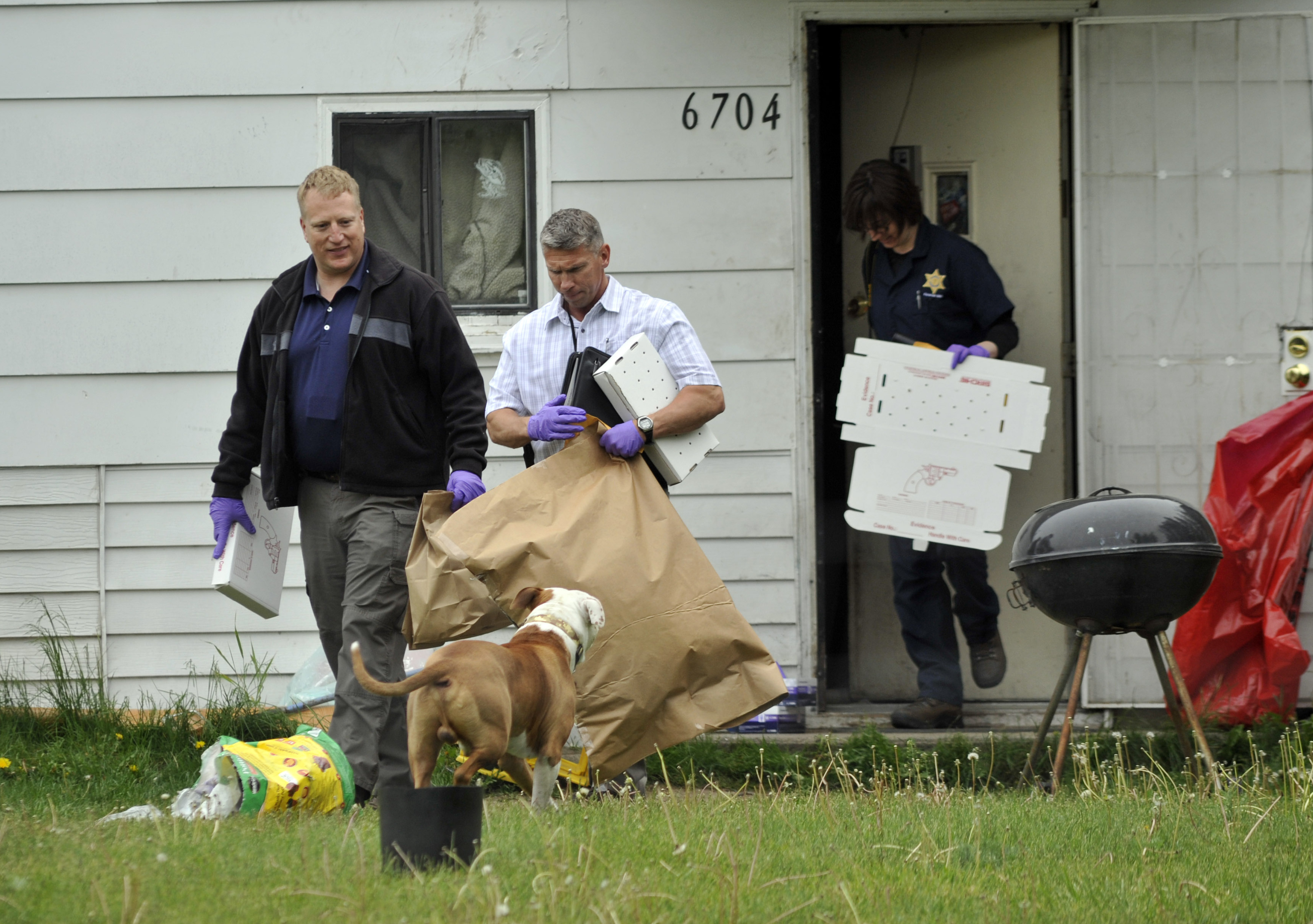 Detective Michael Drapeau, front, and investigators with the Spokane County Sheriff’s Office remove evidence from a house at 6704 E. Third Ave., where Shane Smith, 38, was arrested Tuesday afternoon in connection with the homicide of Warren Flinn. SR photo/Colin Mulvany
