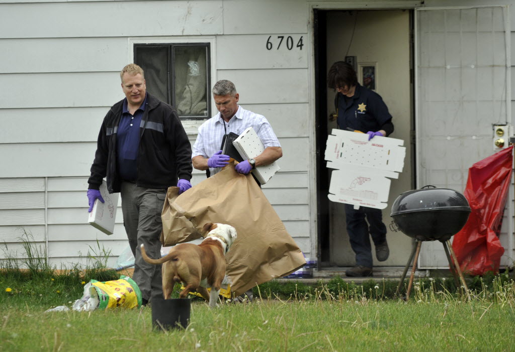 Detective Michael Drapeau and investigators with the Spokane County Sheriff’s Office remove evidence from a house at 6704 E. Third Ave. in Spokane Valley Tuesday. (SRphoto/Colin Mulvany)