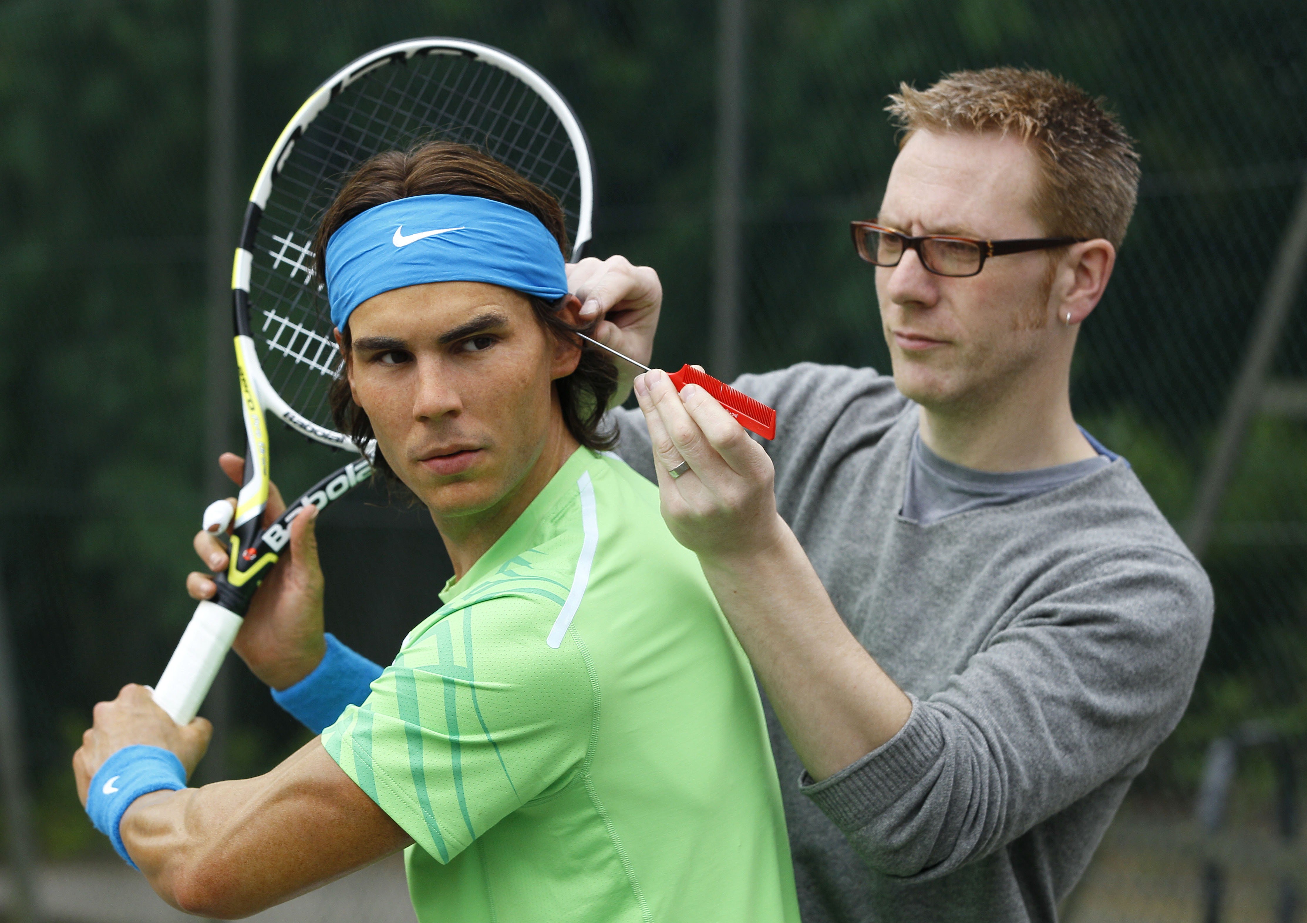 Roger Mackay, one of Madame Tussauds maintenance team puts finishing touches to a model of Rafael Nadal in London, Wednesday, May 23, 2012. The ten time Grand Slam winner and Olympic Gold medalist has been reproduced as a wax model where he will be on display to the public.