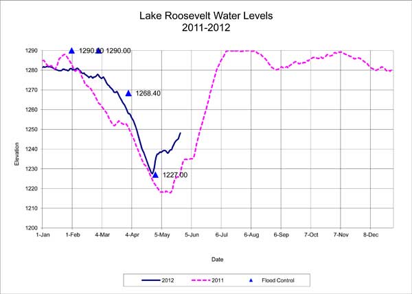 RESERVOIRS — The level of Lake Roosevelt was 1248.90 at 9 a.m. today as the lake continues to fill. The Bureau of Reclamation predicts the levels will continue to rise up to 1 foot a day over the next week.