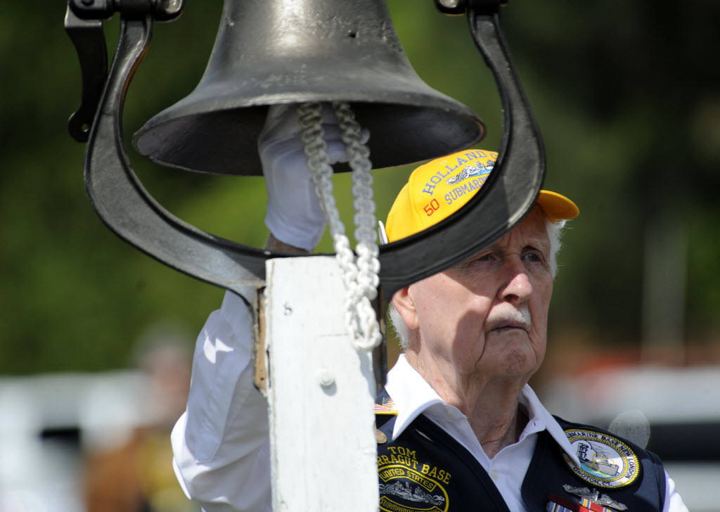 WWII veteran Tom DePew solemnly rings a bell as other veterans read the names of submarines and the number of sailors lost in action Monday, May 28, 2012, during a Memorial Day event on the shores of Hayden Lake. Other veterans of the submarine service dropped a wreath onto the lake’s surface nearby. DePew served on submarines from 1943-1946 after getting basic training at Farragut Naval Training Station in Idaho. Nina Culver SR story here. (Jesse Tinsley SR photo)