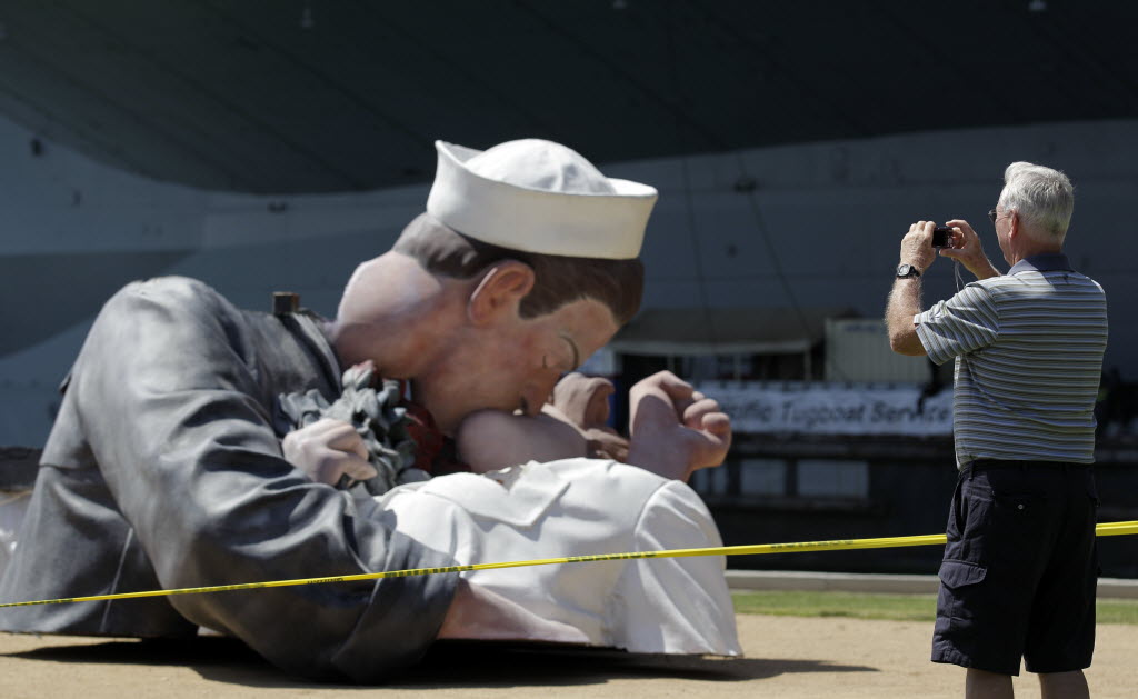 Larry O’Brian, of Worcester, Mass., takes a picture of sections of the statue “Unconditional Surrender,” as the artwork is dismantled from its spot alongside the USS Midway aircraft carrier museum, right, earllier today in San Diego. Though the current version of the statue is being removed, the famous statue of two Navy sweethearts kissing on the San Diego waterfront will be replaced by a version in bronze, with a price tag of about $1 million. (AP Photo/Gregory Bull)