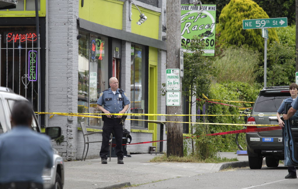 A Seattle Police officer stands outside a cafe where a shooting took place Wednesday. A gunman opened fire at the cafe in Seattle’s University district Wednesday, killing two people and critically wounding three others. Police are searching for the gunman, described as a man in his 30s wearing dark clothes. Seattle Times story here. (AP Photo/Ted S. Warren)