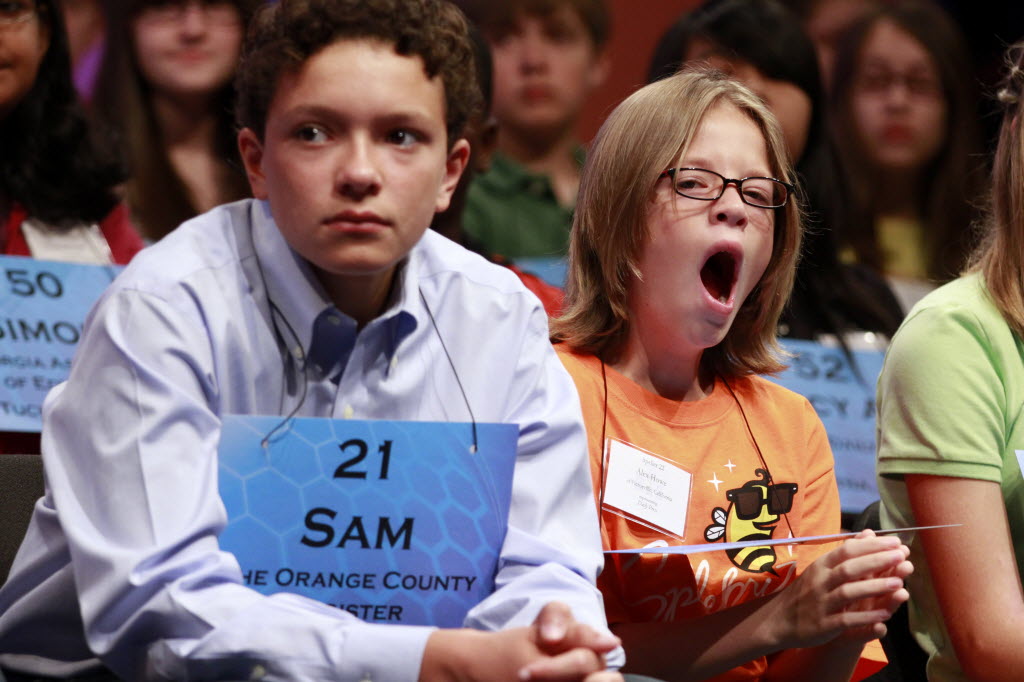 Alex Howe, 9, of Victorville, Calif,, right, yawns next to Sam T.E. Nitz, 13, of Costa Mesa, Calif., as they compete in the National Spelling Bee today in Oxon Hill, Md. (AP Photo/Jacquelyn Martin)