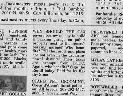 In the current issue of the Nickels Worth, state Rep. Kathy Sims, R-OpenCDA.com, has paid for a classified ad attacking urban renewal and City Hall (above).