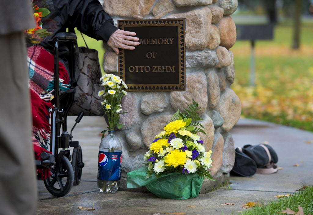 Ann Zehm pauses to reflect on her son’s memorial after a plaque dedication ceremony Wednesday in Mission Park. The city memorial was part of a civil settlement with family members of Zehm, who was beaten, shocked with Tasers and hogtied by Spokane police after being mistakenly implicated in a possible theft. He died two days later without regaining consciousness. Story here. (SR photo: Dan Pelle)