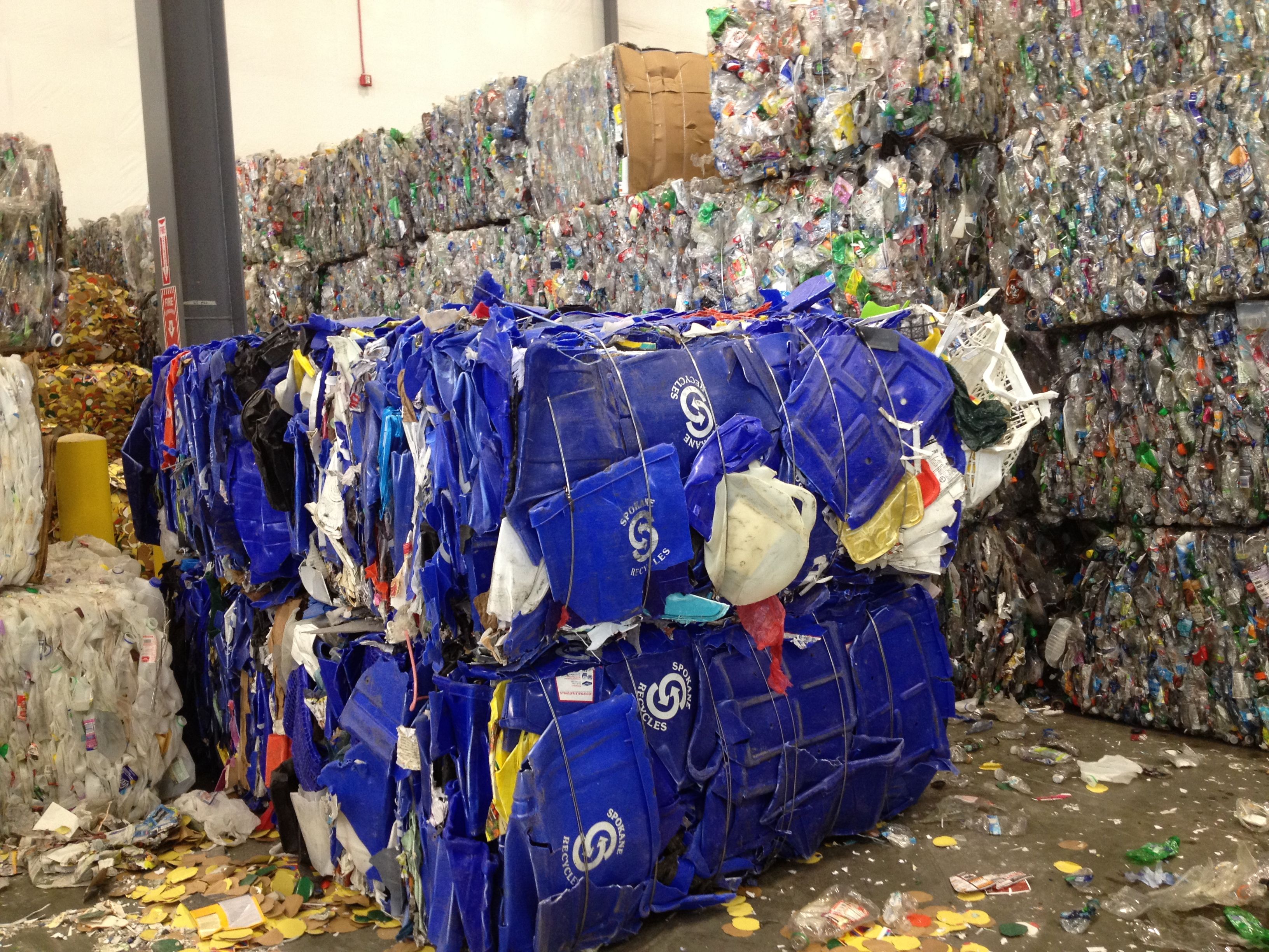 Among the tons of garbage being processed there are the old blue bins that Spokane city residential waste customers were using. Here’s how they look when squashed and baled. The bales will go to regional recyclers for reuse.