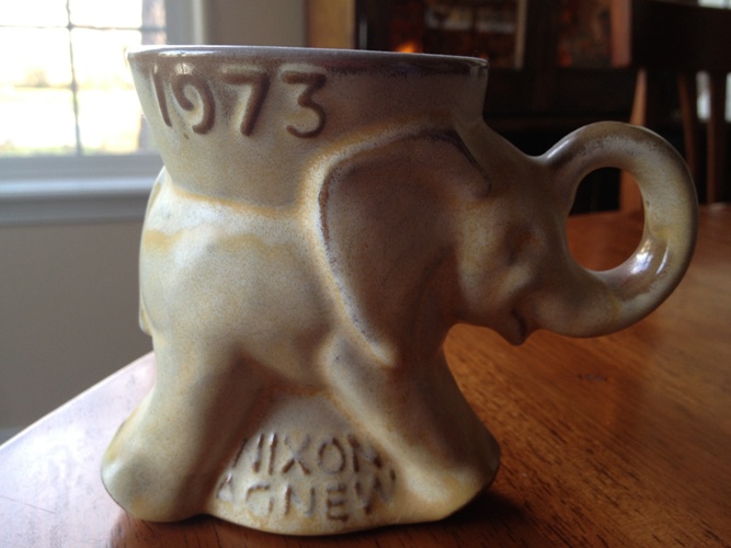 Huckleberries asked readers to describe any political paraphernalia from days gone by & Christa Hazel sent this photo in — of Frankoma mug from 1973, touting the GOP presidential ticket of Richard Nixon and Spiro Agnew. Any of you “nattering nabobs of negativity” recall how that twosome worked out?