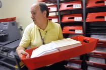 (Jesse Tinsley’s SR photo: Spokane County elections worker Ralph Gruss grabs another tray of ballots to be put through counting machines at the elections office on Monday)